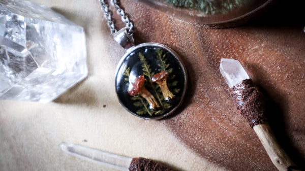 Each mushroom is foraged, preserved, and delicately adorned into unique jewelry and accessories.